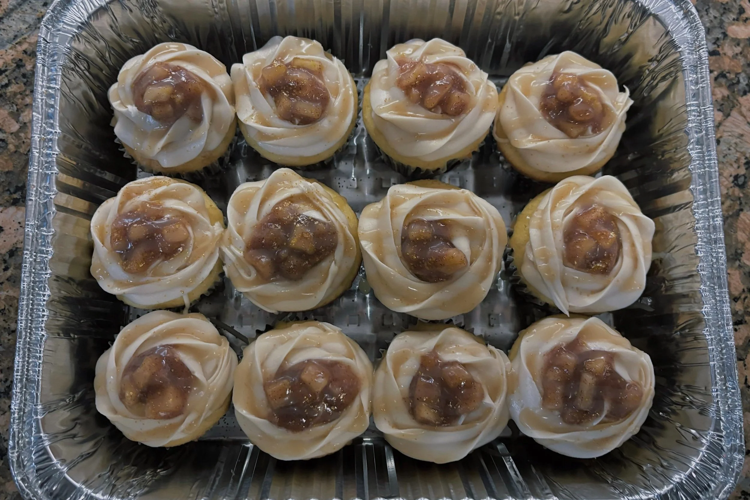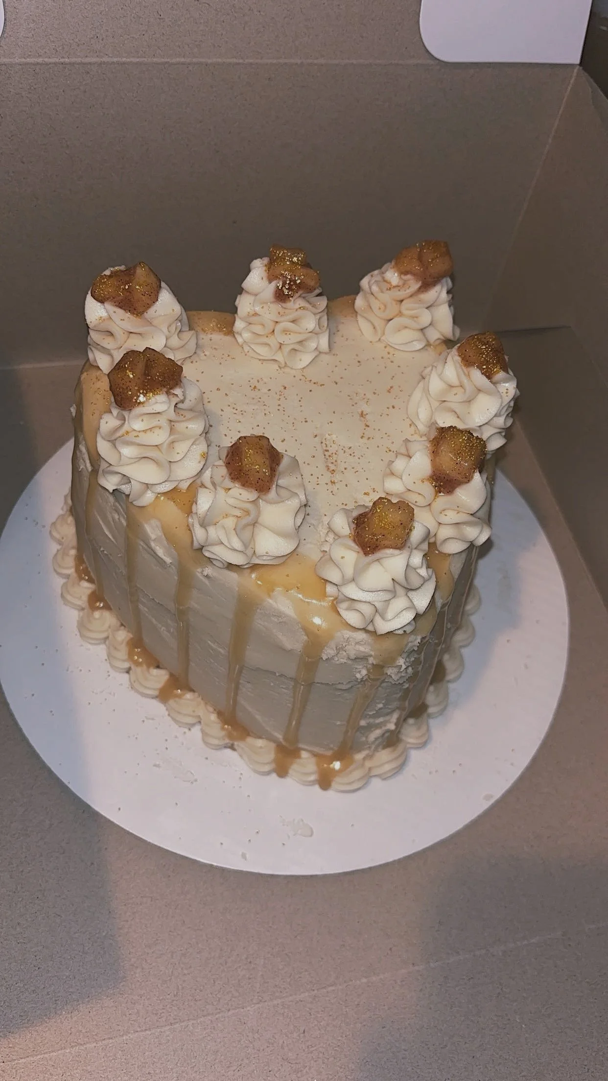 One of the first cakes I have ever made— a caramel apple cake! It was a two layered vanilla cake with a brown sugar apple filling and a caramel buttercream with a homemade caramel drip sauce. Below are the matching cupcakes!